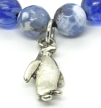 The engaging Blue Penguin Adjustable Bracelet is based on lapis lazuli, zebra stone, silver and fire agate, and hematite. It is in adult Size at 7 to 8 inches (18-20 cm).