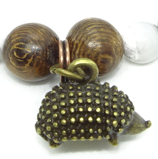 The adorable Hedgehog Bracelet has wood jasper, freshwater pearl, howlite, brecciated jasper, and mother of pearl beads. It is an adjustable bracelet sized for teens at 7 to 7.5 inches (17.5 to 19 cm).