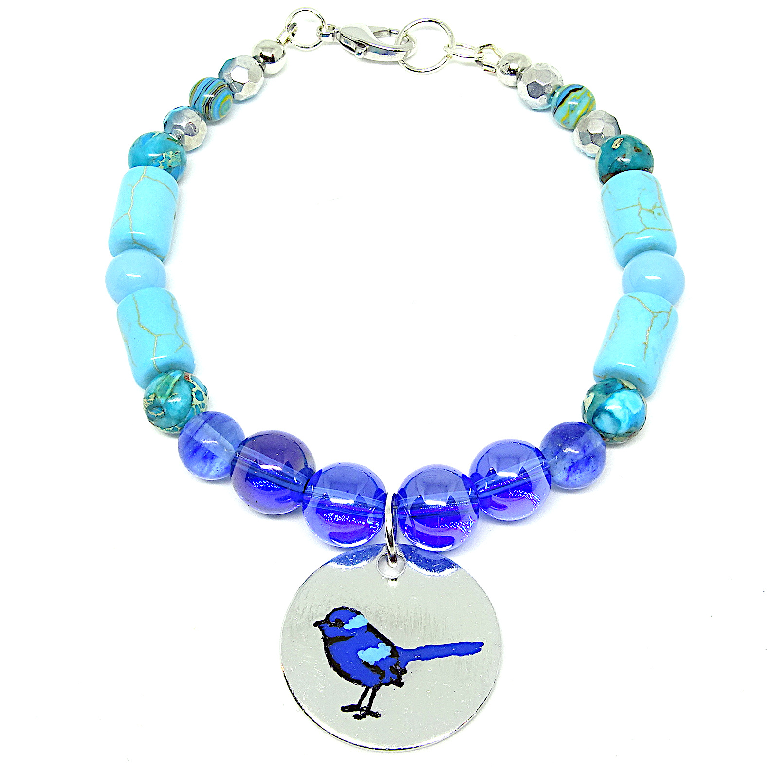 The beautiful, contrasting blues of Superb Fairywren Bracelet are highlighted by Swarovski crystal pearls, as well as Imperial Jasper, and Howlite. At 7 ¼ inches (18.5 cm) is in women’s size.