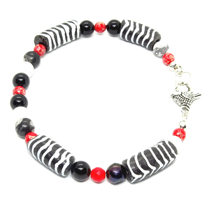 Black Swarovski crystal pearls highlight the Downy Woodpecker Bracelet. Like the bird’s stripped feathers our Zebra stone is striped, and magnesite mimics the red feathers on the back of its head. Special bird clasp. It is men’s size at 8.5 inches (21.5 cm).